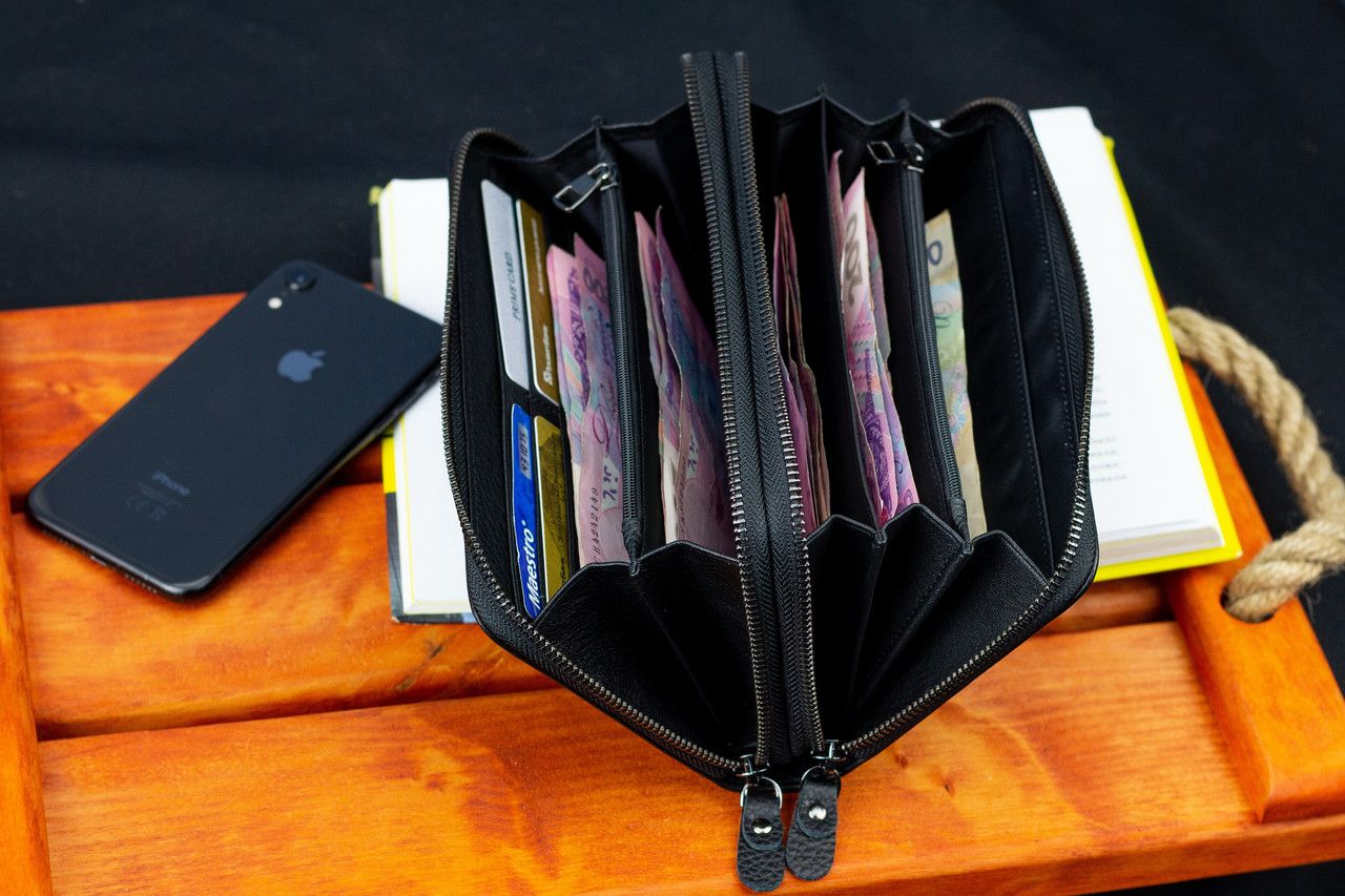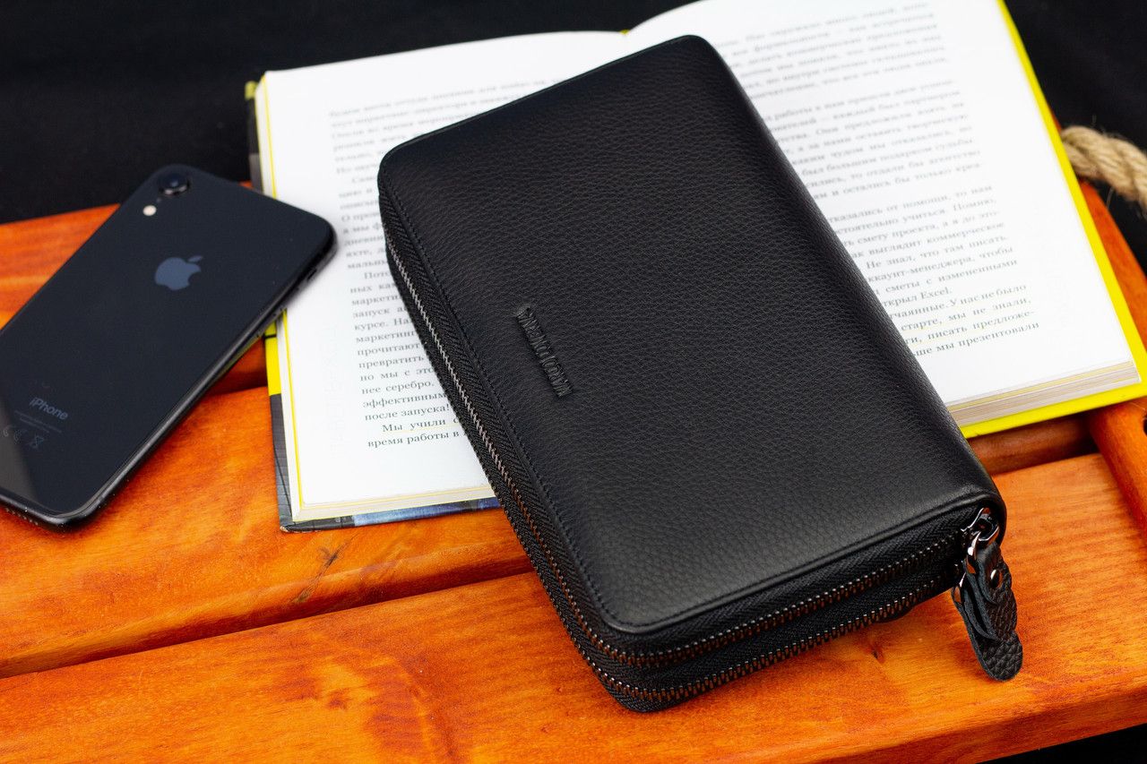 Чоловічий гаманець з натуральної шкіри підійде тим, хто цінує і стиль, і практичність. Модель має два окремі відділення на блискавці. Як в одному, так і в другому зручно тримати банкноти, а також розподіляти їх за номіналом. Додаткові суми (або чеки) можна відкладати у прилеглих кишенях. Для монет підходять кишені на блискавці, що служать перегородками. Кредитні картки в цьому шкіряному гаманці зберігаються в окремому блоці, що складається з 18 секцій. До того ж там є фіксатор для ручки. Завдяки двом ременям (на долоню та зап'ястя) аксесуар перетворюється або в портмоне, або в клатч.