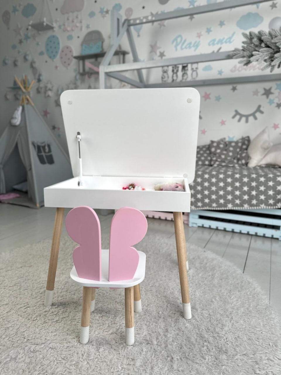 Дитячий столик білий і стільчик метелик рожевий із нішею для олівців і розмальовок LalaKids