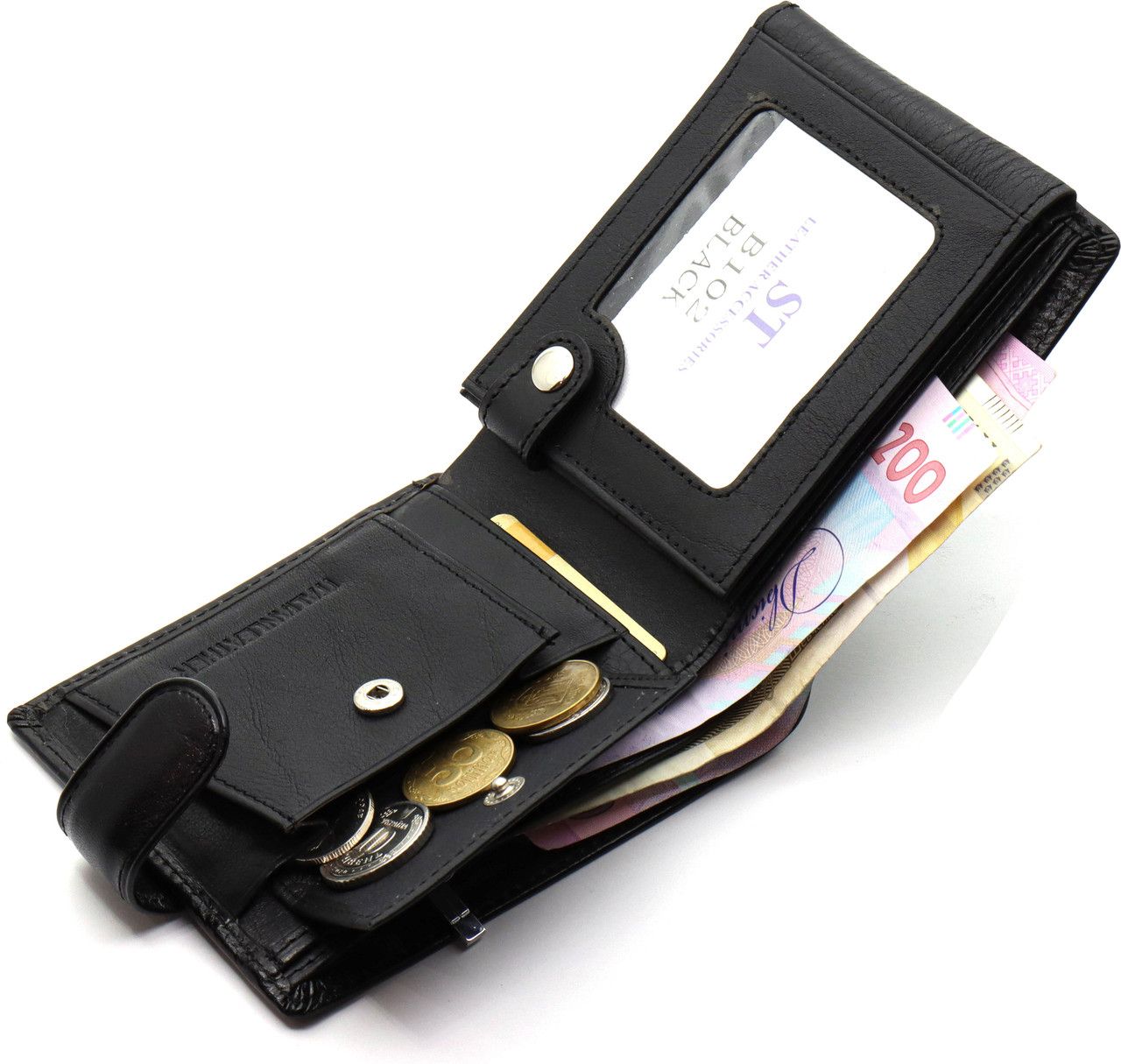 Шкіряний гаманець відповідного дизайну легко поміститься в кишеню піджака, куртки чи пальта. Чоловікам сподобається тримати купюри та монети в одному місці. У виробі є 3 відділення для великих банкнот, одне з них на блискавці. Для монет є кишеня на кнопці. У секціях чоловічого гаманця зручно носити карти для безготівкового розрахунку. Прозорі віконця підійдуть для візиток, фото та прав.