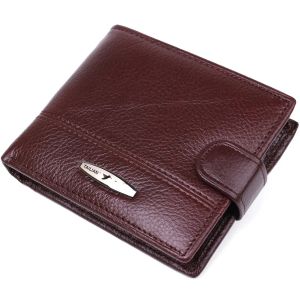 Модель гаманця – класика коричневого кольору. Відмінною особливістю даного гаманця є те, що в нього вбудована візитниця, яка закривається на хлястик з кнопкою. Всередині гаманець виконаний із натуральної шкіри у поєднанні з міцним текстилем. Закривається гаманець на хлястику з кнопкою. У комплекті йде картонна коробка жовтого кольору.