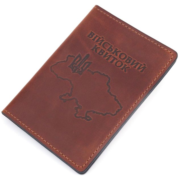 Глянцевая обложка коричневого для военного билета с патриотическим тиснением карты Украины, на лицевой стороне. Изделие сшито из качественной итальянской кожи с высоким показателем износостойкости, которая защитит от повреждений документ на очень долгое время. Аксессуар имеет разворот для военного билета, две ячейки для карточек, без застежки, упакованный в фирменный чехол.