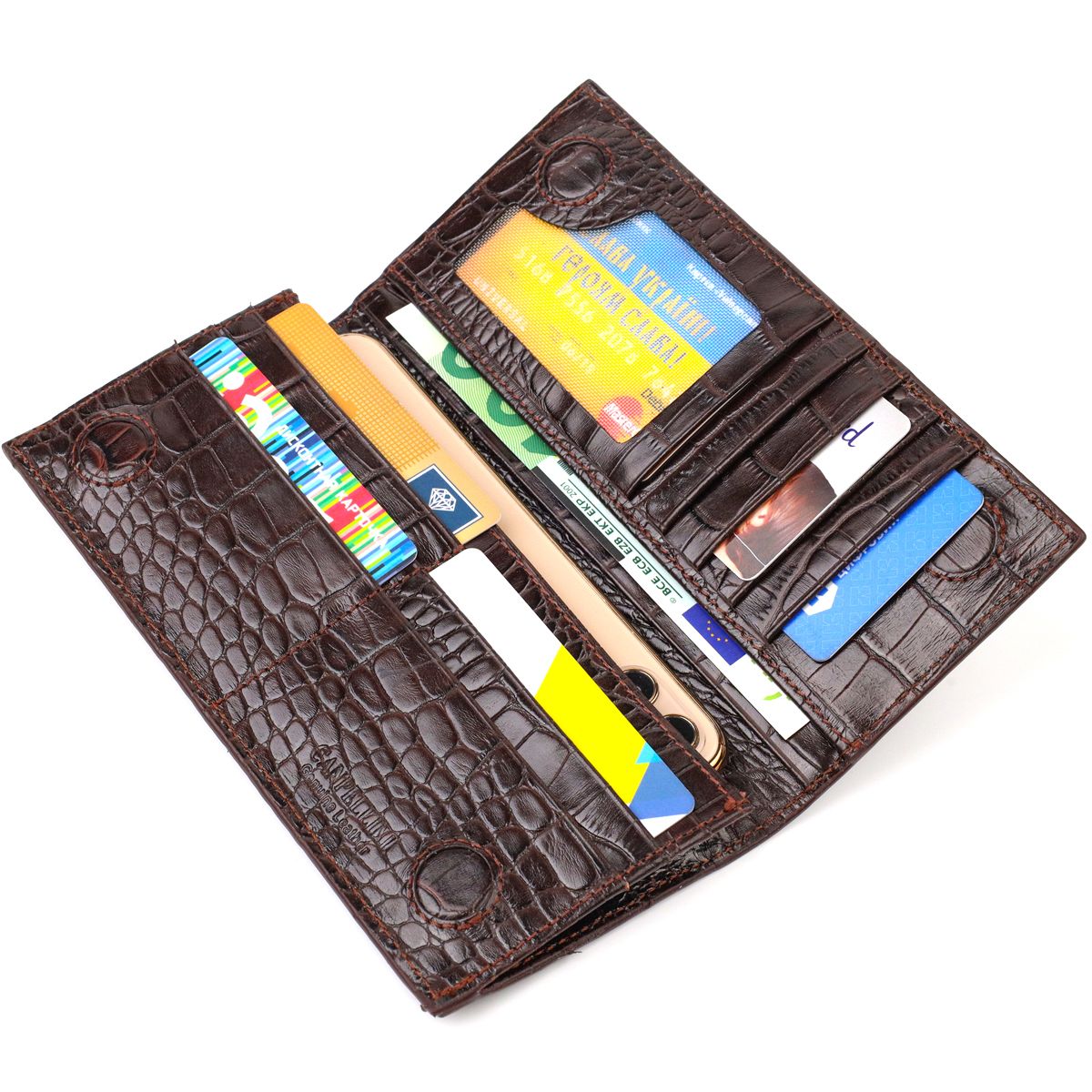 Вертикальный узкий мужской кошелек из натуральной кожи с тиснением под крокодила. Аксессуар имеет одно основное отделение в которое помещаются купюры всех номиналов, одиннадцать карманов для карточек (один под сеточкой), два скрытых кармана и карман на молнии внутри. Закрывается аксессуар пополам на магниты. Покупая кожаный аксессуар этой фирмы, себе или в подарок, будьте уверены, что он прослужит Вам не один год.