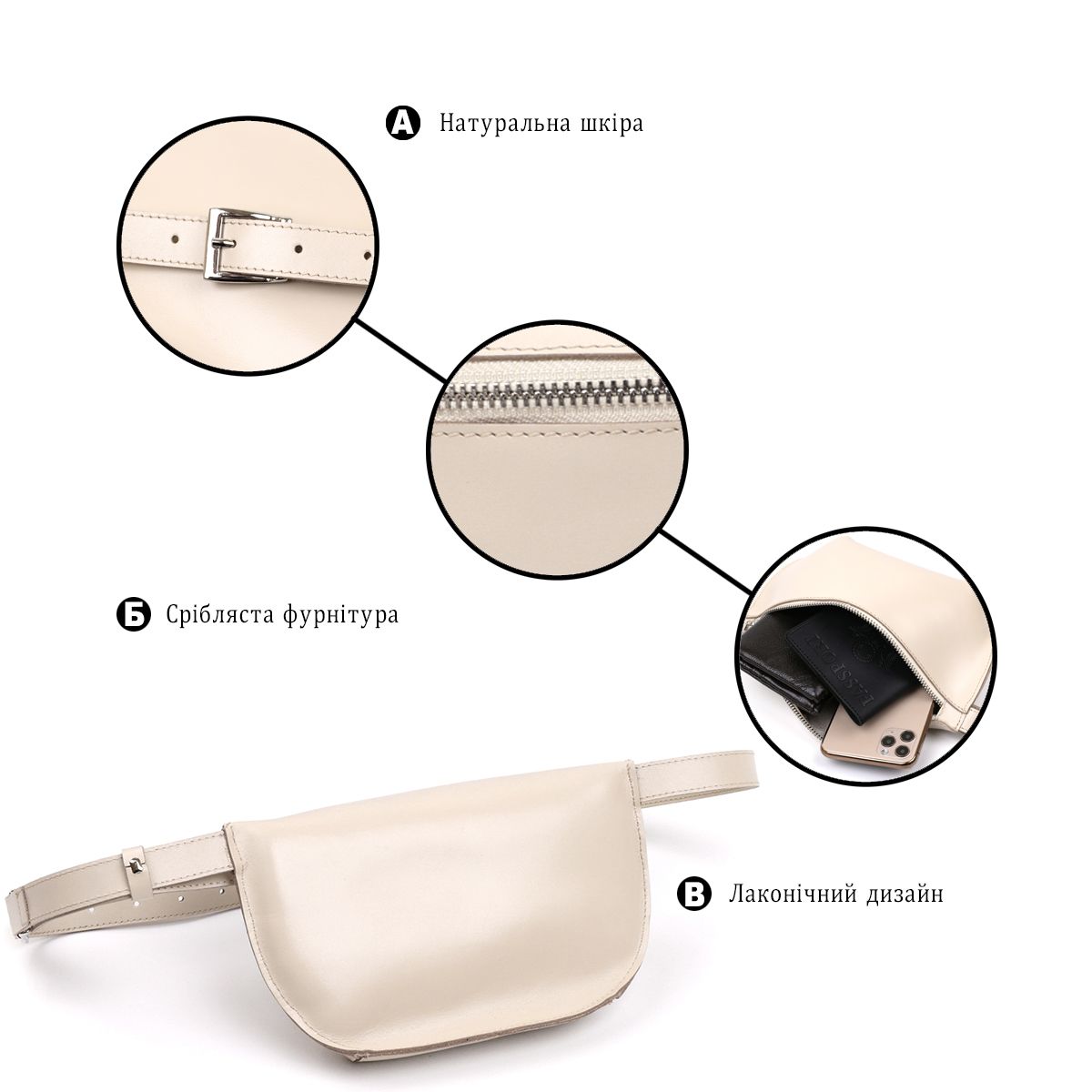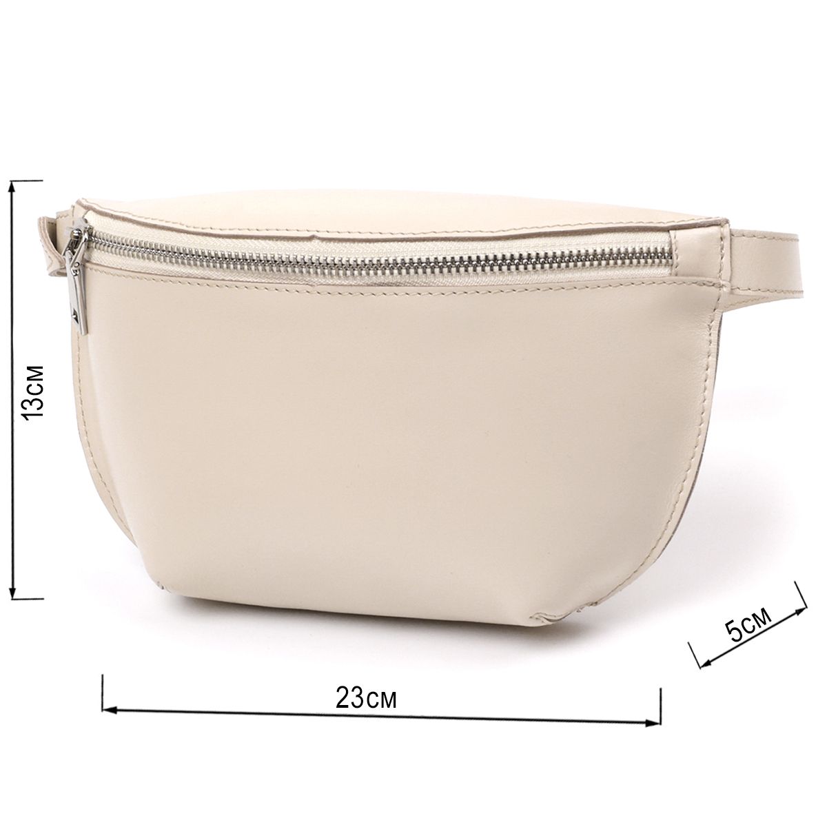 Стильна та сучасна жіноча бананка з натуральної шкіри високої якості, що має підвищені характеристики міцності. Має одне просторе головне відділення на блискавці. Ремінець регулюється по довжині та виконаний з натуральної шкіри. Колір виробу - бежевий, фактура - гладка і дуже приємна на дотик.