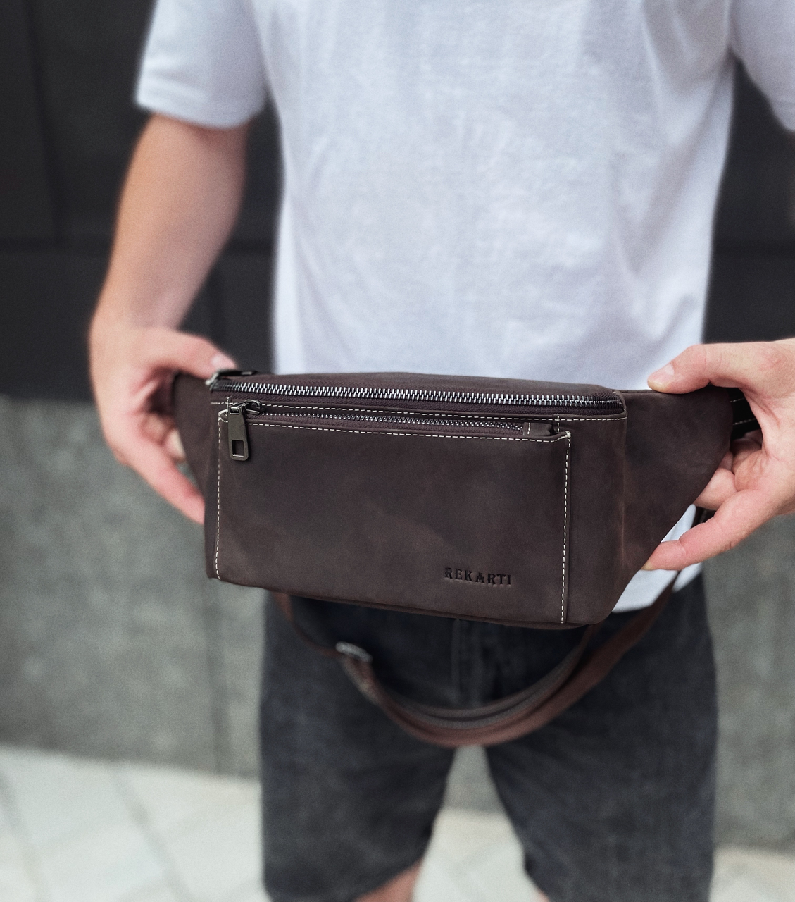 Стильна поясна сумка з натуральної шкіри — чудове придбання для практичного чоловіка. Головне відділення закривається на блискавку. Внутрішня підкладка виготовлена з міцного текстильного матеріалу та зворотного боку шкіри. Сумка має багато функціональних кишень на блискавці: 1 - з лицьового боку, 1 — з тильного боку. Пояс тканинний, а застібка на поясі виготовлена з високотехнологічного пластику.