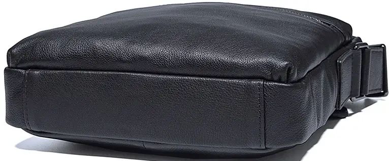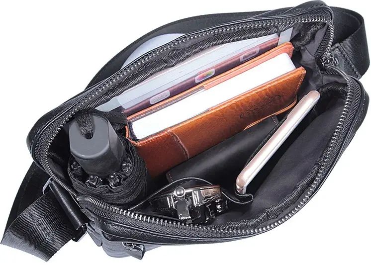 Оригінальна сумка із міцної якісної телячої шкіри. Сумка має середні розміри і поміщає все необхідне для чоловіка на кожен день. У ній знайдеться місце телефону, планшету, гаманцю, зарядки та інші необхідні речі. Особливістю даної моделі є слот для навушників, що дозволяє слухати музику, не виймаючи плеєр або телефон з сумки. Чорний колір шкіри та текстилю у цьому виробі успішно відтінюється металевими елементами кольору темного срібла.